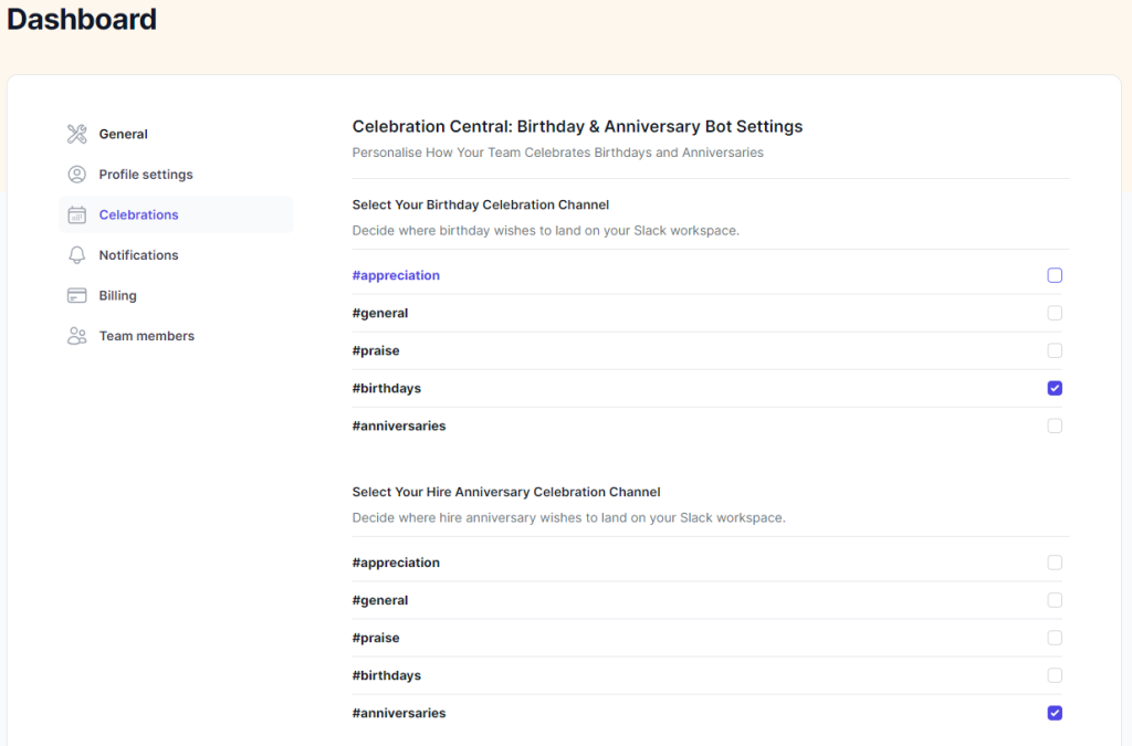 You can select one channel for birthdays and one channel for work anniversaries. Our Bot will post celebration announcements on these channels.